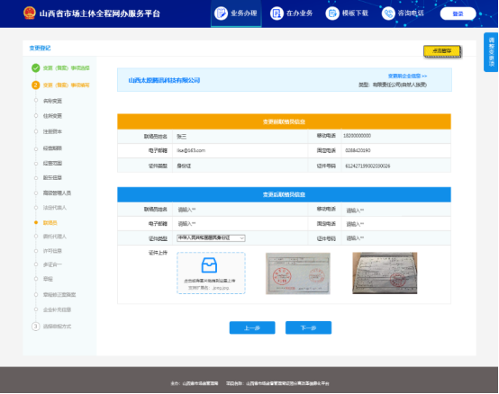 進(jìn)入聯(lián)絡(luò)員變更頁(yè)面,我們可以看到變更前的聯(lián)絡(luò)員信息,并需要在變更后聯(lián)絡(luò)員信息位置,填寫變更后的聯(lián)絡(luò)員信息并上傳證件。點(diǎn)擊“下一步”,進(jìn)入后續(xù)事項(xiàng)填寫。如圖所示。