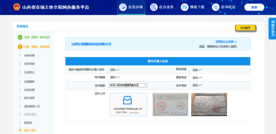 進(jìn)入委托代理人填寫頁(yè)面,我們直接錄入本次辦理變更事項(xiàng)的委托代理人信息并上傳證件。點(diǎn)擊“下一步”,進(jìn)入后續(xù)事項(xiàng)填寫。如圖所示。