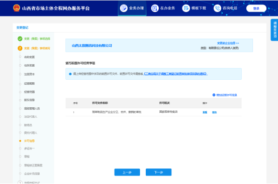 進(jìn)入前置許可變更頁(yè)面,我們需要根據(jù)經(jīng)營(yíng)范圍進(jìn)行調(diào)整,當(dāng)經(jīng)營(yíng)范圍變更且涉及前置許可時(shí),需要在此處填寫變更后的前置許可經(jīng)營(yíng)事項(xiàng),包含許可機(jī)關(guān)名稱、許可機(jī)關(guān)。當(dāng)經(jīng)營(yíng)范圍變更不涉及前置許可或無(wú)變更,用戶不需要填寫此項(xiàng),可直接點(diǎn)擊“下一步”,進(jìn)入后續(xù)事項(xiàng)填寫。如圖所示。