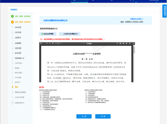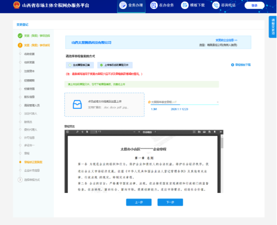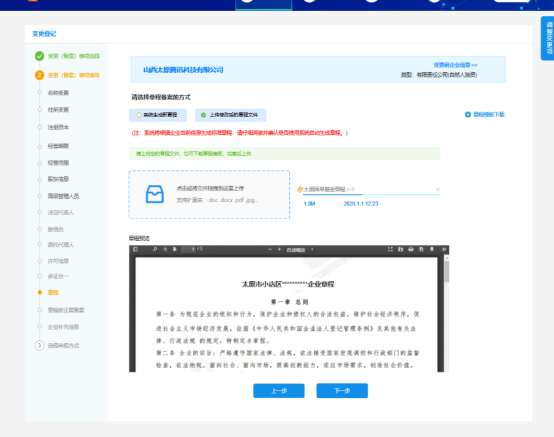 對(duì)于內(nèi)資企業(yè),我們可以看到系統(tǒng)為我們自動(dòng)生成的新章程;對(duì)系統(tǒng)生成章程不滿足需求的用戶,可下載章程模板完善后上傳,也可以直接上傳自己的章程文件。點(diǎn)擊上傳按鈕后,輸入文件名稱,添加文件,完成上傳,并可預(yù)覽上傳內(nèi)容。點(diǎn)擊“下一步”,進(jìn)入后續(xù)事項(xiàng)填寫。如圖所示。