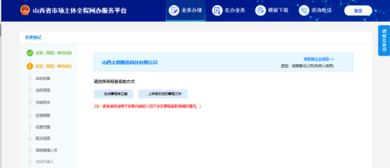 其中,當(dāng)勾選“企業(yè)名稱變更”時(shí),系統(tǒng)判斷是否已經(jīng)預(yù)先進(jìn)行了名稱變更自主申報(bào),如未進(jìn)行申報(bào),需要先自主申報(bào)通過(guò)后才能勾選;當(dāng)勾選了“注冊(cè)資本變更”項(xiàng)時(shí),需要同時(shí)勾選“股東信息變更”項(xiàng);當(dāng)勾選了“經(jīng)營(yíng)范圍變更”項(xiàng)時(shí),在后續(xù)填寫內(nèi)容時(shí),需要對(duì)前置許可和多證合一兩項(xiàng)內(nèi)容進(jìn)行填寫;當(dāng)勾選了“企業(yè)名稱變更”、“住所變更”、“注冊(cè)資本變更”、“營(yíng)業(yè)期限變更”、“經(jīng)營(yíng)范圍變更”、“股東信息變更”、“法定代表人變更”事項(xiàng)時(shí),需要同時(shí)勾選“章程備案”或“章程修正案?jìng)浒浮敝械娜魏我粋€(gè)。