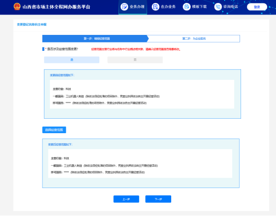 如選擇是,需要重新選擇企業(yè)經(jīng)營(yíng)范圍。點(diǎn)擊下一步,進(jìn)入為企業(yè)起名頁(yè)面。