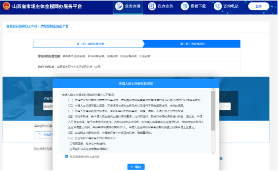 當(dāng)我們進(jìn)入為企業(yè)起名頁(yè)面,首先需要閱讀《申請(qǐng)人自主申報(bào)名稱須知》,勾選“我已閱讀并知曉上述內(nèi)容”,點(diǎn)擊“確認(rèn)”,為企業(yè)進(jìn)行起名。