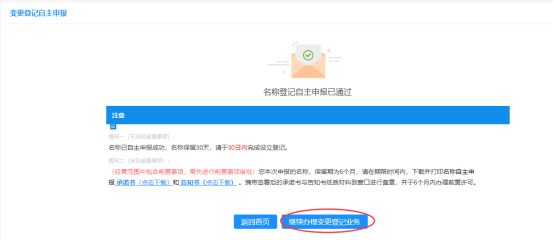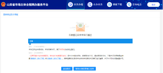 點(diǎn)擊“下一步”,系統(tǒng)會(huì)告知我們名稱是否已經(jīng)通過(guò)名稱校驗(yàn),如企業(yè)經(jīng)營(yíng)范圍不涉及前置事項(xiàng),名稱保留30天,我們需要在30日內(nèi)完成變更登記;如涉及前置事項(xiàng),名稱保留6個(gè)月,我們需要在期限內(nèi)下載并打印名稱自主申報(bào)《承諾書》和《告知書》,攜帶簽署后的承諾書與告知書紙質(zhì)材料到窗口進(jìn)行蓋章,并于6個(gè)月內(nèi)辦理前置許可。