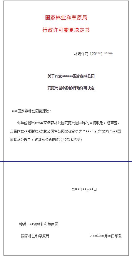 被許可人需要變更《國(guó)家林業(yè)和草原局準(zhǔn)予行政許可決定書(shū)》注明的公園名稱(chēng)、被許可人名稱(chēng)、公園面積或地理坐標(biāo)(范圍不變)的,將變更內(nèi)容證明材料提交國(guó)家林業(yè)和草原局,按一般程序辦理。