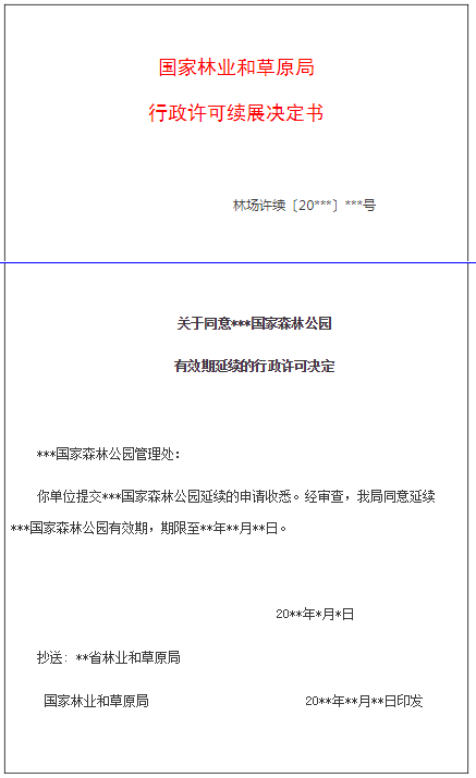 《國(guó)家林業(yè)和草原局準(zhǔn)予行政許可決定書(shū)》注明的有效期屆滿(mǎn)需要延續(xù)的,被許可人應(yīng)當(dāng)在有效期屆滿(mǎn)三十日前提出申請(qǐng),按一般程序辦理。