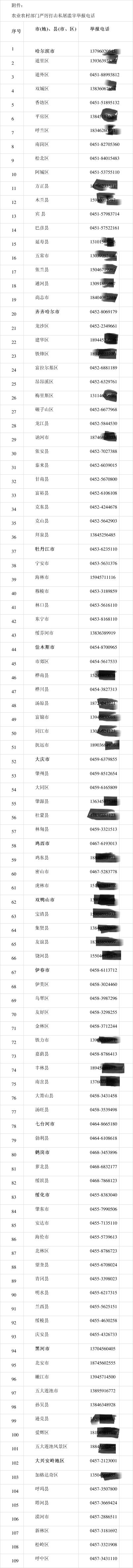 為規(guī)范黑龍江省農(nóng)業(yè)違法線索投訴舉報(bào)工作,暢通農(nóng)民群眾農(nóng)業(yè)違法線索投訴舉報(bào)渠道,及時(shí)查處各類農(nóng)業(yè)違法行為,保障人民群眾合法利益,現(xiàn)將黑龍江省各級(jí)農(nóng)業(yè)農(nóng)村部門農(nóng)業(yè)違法線索投訴舉報(bào)電話及投訴舉報(bào)范圍公示如下: