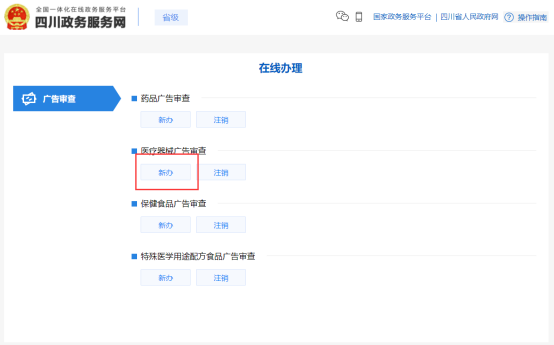 1) 醫(yī)療器械廣告審查,點(diǎn)擊紅色圓圈內(nèi)的新辦