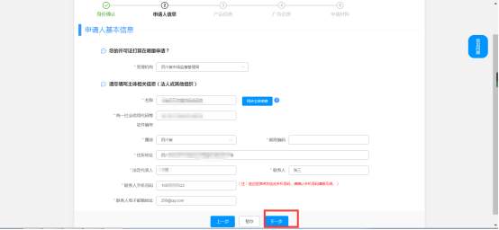 3) 填寫申請(qǐng)人信息,可通過輸入企業(yè)名稱或者統(tǒng)一信用代碼后點(diǎn)擊同步主體信息。如果不確定信息,可以先暫存,確認(rèn)信息后點(diǎn)擊下一步。