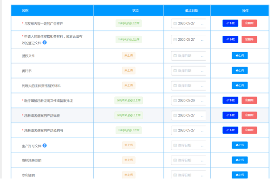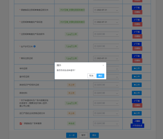 6) 上傳文件大小請(qǐng)不要超過10MB(除廣告樣件);請(qǐng)先填報(bào)申請(qǐng)材料有效截止日期后,再上傳材料。補(bǔ)正材料需刪除原材料后重新填報(bào)日期并上傳。申請(qǐng)材料說明可點(diǎn)擊“?”查看。申請(qǐng)書可點(diǎn)擊自動(dòng)生成,系統(tǒng)會(huì)根據(jù)填寫的信息自動(dòng)生成申請(qǐng)書。