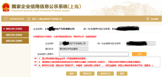 4.填寫并上傳全體投資人承諾書(shū),點(diǎn)擊“保存并公示”完成簡(jiǎn)易注銷公告。