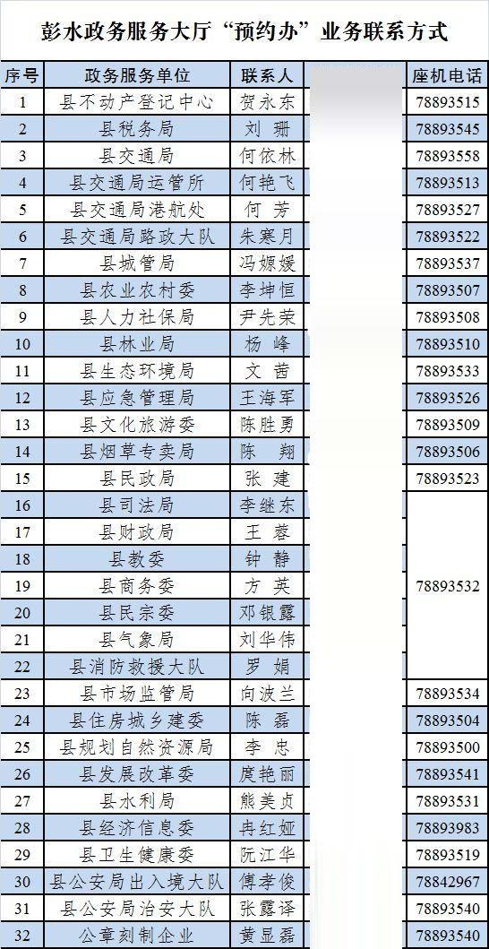 聯(lián)系地址:彭水苗族土家族自治縣紹慶街道濱江社區(qū)兩江行政樓2樓行政服務中心。辦公時間:夏季9∶00—12∶30、14∶30—18∶00(周一至周五,節(jié)假日除??外);冬季9∶00—12∶30、??14∶00—17∶30(周一至周五,節(jié)假日除外)。