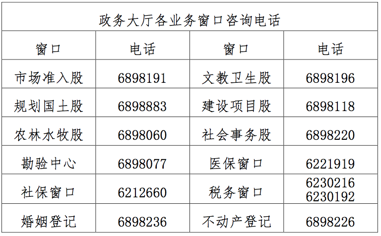 政務(wù)大廳各業(yè)務(wù)窗口咨詢電話。