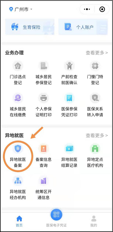 第一步:微信搜索“粵醫(yī)保”小程序,按提示操作登錄,登錄成功之后,在“異地就醫(yī)”中點擊“異地就醫(yī)備案”小圖標進入操作頁面。
