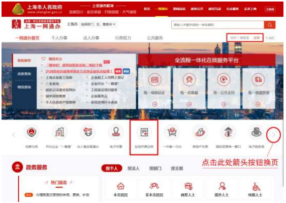 1. 登錄“一網(wǎng)通辦”總門戶(http://zwdt.sh.gov.cn)【新用 戶須先注冊(cè),老用戶須登錄賬戶】;在首頁(yè)下圖位置找到“在線開(kāi)具 證明”按鈕,點(diǎn)擊進(jìn)入;(若在此欄中沒(méi)有找到“在線開(kāi)具證明”按 鈕,請(qǐng)點(diǎn)擊此欄右側(cè)箭頭符號(hào)換頁(yè)再查找)
