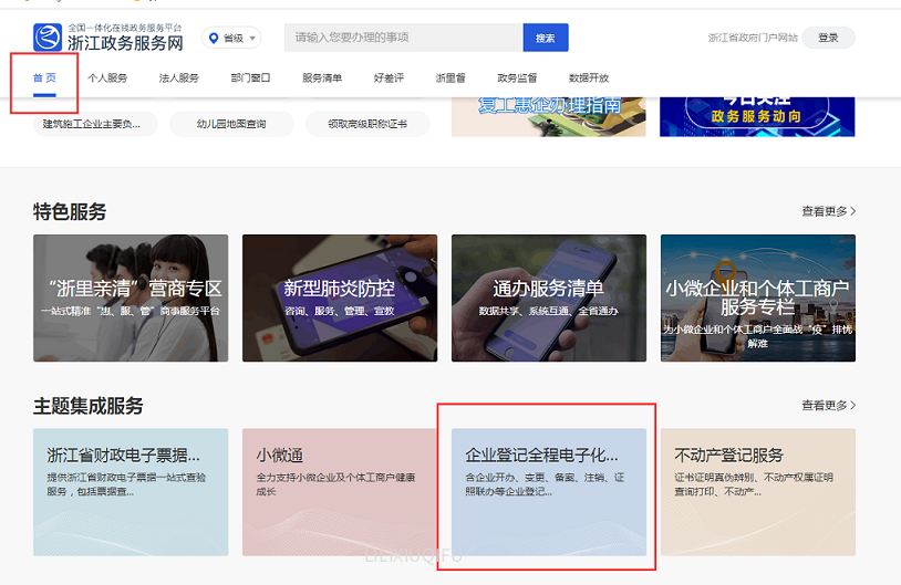 登錄入口:使用電腦打開浙江政務(wù)服務(wù)網(wǎng),在首頁模塊,通過主題集成服務(wù)找到企業(yè)登記全程電子化登記平臺,點(diǎn)擊馬上辦理進(jìn)入全程電子登記平臺。