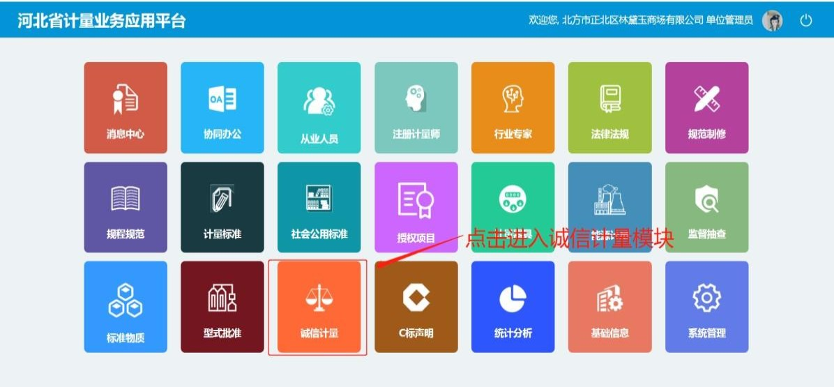 注冊(cè)用戶(單位管理員用戶)注冊(cè)審核通過后,登陸平臺(tái),點(diǎn)擊“誠信計(jì)量”圖標(biāo),進(jìn)入誠信計(jì)量模塊。