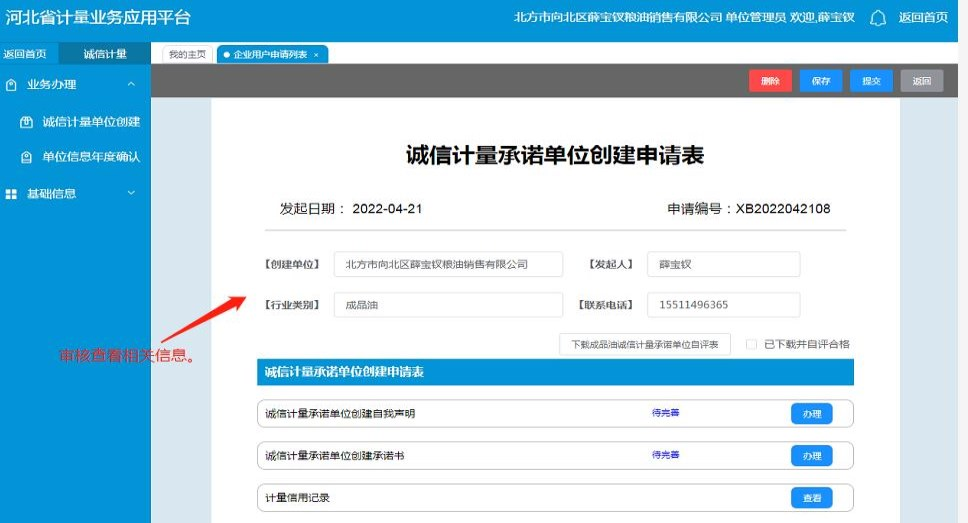 選擇行業(yè)后,進(jìn)入本行業(yè)誠信計(jì)量承諾創(chuàng)建申請(qǐng)表界面。此界面基礎(chǔ)信息自動(dòng)生成,申請(qǐng)單位自行審核,審核無誤后,開始誠信計(jì)量 承諾申請(qǐng)流程。