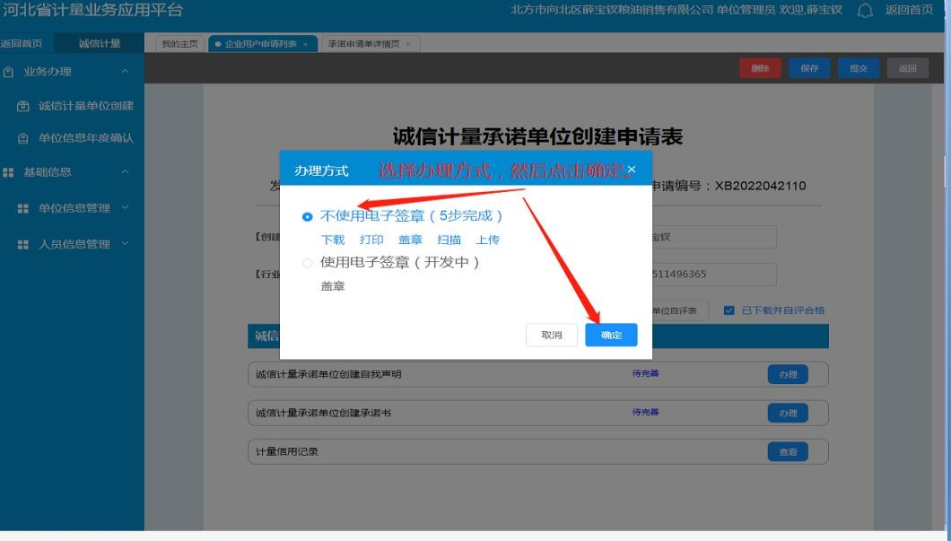 點(diǎn)擊誠信計(jì)量承諾單位創(chuàng)建自我聲明辦理按鈕,選擇辦理方式,其包括:使用簽章和不使用簽章。選擇方式后進(jìn)入相應(yīng)申請(qǐng)界面。