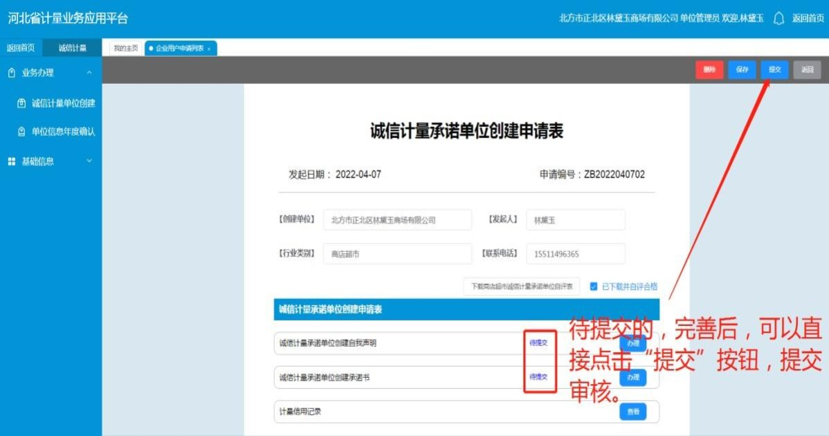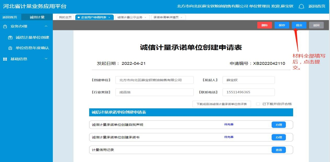 上傳企業(yè)誠信計(jì)量承諾單位創(chuàng)建自我聲明和承諾書完成后,進(jìn)入主界面,點(diǎn)擊提交。自此,材料已申請(qǐng)成功。