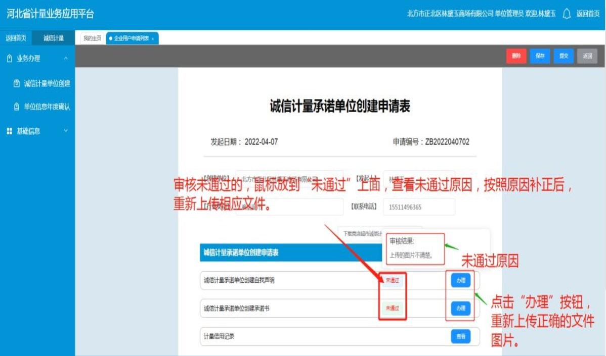 如果為材料待補(bǔ)正的,查看退回原因,按照要求重新上傳文件圖片后,點(diǎn)擊“提交”按鈕,重新提交審核。