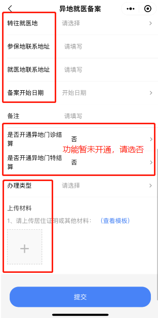 需注意的是,我市參保人【備案類例】選擇異地安置退休人員、異地長期居住人或常駐異地工作人員的,備案前需填寫好《廣東省異地就醫(yī)登記備案表》(可通過登陸江門市醫(yī)療保障局官方網(wǎng)站“通知公告——江門市醫(yī)療保障經(jīng)辦業(yè)務(wù)常用表格下載”下載),并在“上傳材料”處一同拍照上傳。