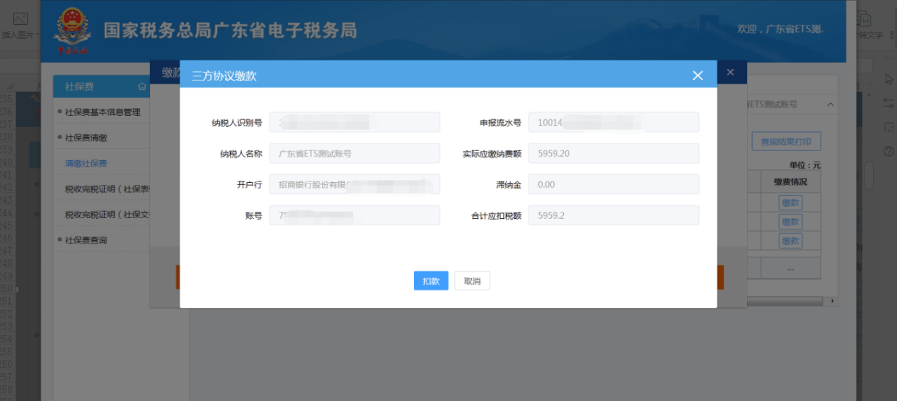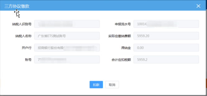 點擊【三方協(xié)議繳款】彈出“三方協(xié)議繳款”窗口,確認扣款的銀行賬號和繳款信息無誤后,點擊【扣款】按鈕,系統(tǒng)根據(jù)簽約銀行賬號自行扣款;