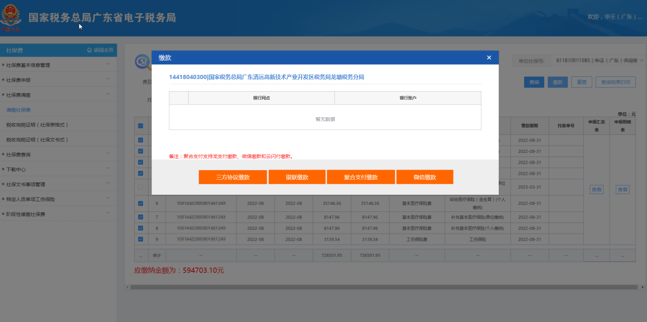 d) 選擇需要清繳的社保費欠費信息,點擊【繳款】彈出“繳款”窗口,選擇不同的繳款方式進行繳款;(有效簽訂三方協(xié)議的銀行賬號顯示在“繳款”窗口);