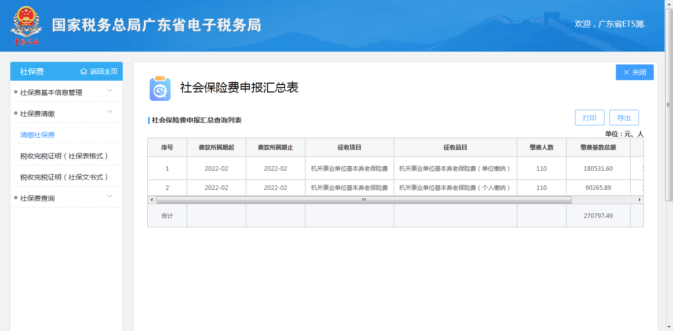 【打印】:打印當前【社會保險費申報匯總查詢列表】信息;