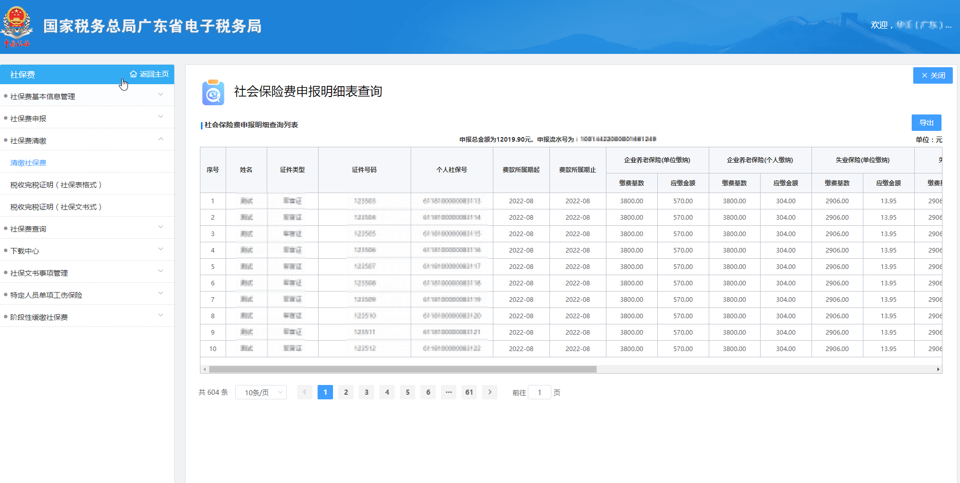 【導(dǎo)出】:導(dǎo)出當前【社會保險費申報明細查詢列表】數(shù)據(jù)文件到本地。