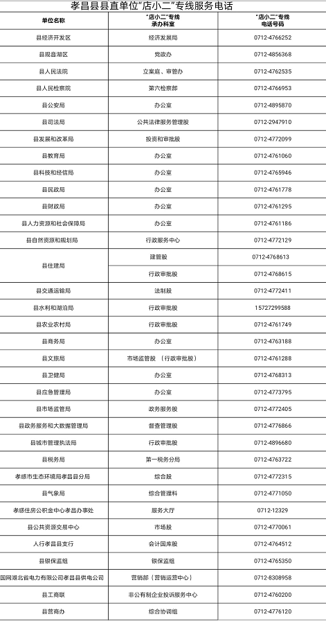 附件:孝昌縣縣直單位“店小二”專線服務(wù)電話