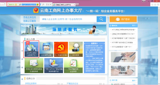 在IE瀏覽器的地址欄中輸入訪問地址http://gsxt.ynaic.gov.cn/webportal1/,然后點擊鍵盤上的“回車鍵(Enter)”,進入“云南工商網上辦事大廳”主界面,如下圖所示。