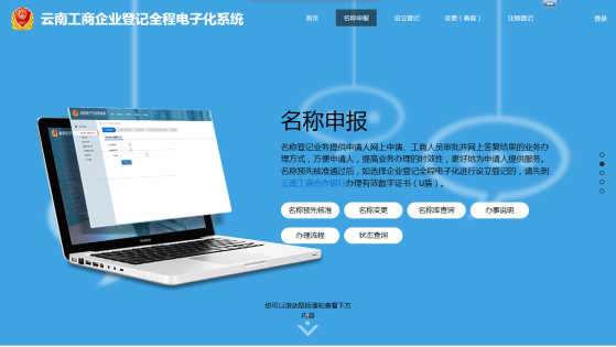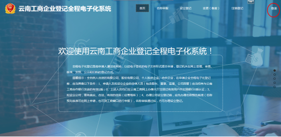 在“云南工商網上辦事大廳”的主界面上,點擊“企業(yè)網上登記(全程電子化)”進入“云南工商企業(yè)登記全程電子化系統(tǒng)”,頁面如下圖所示: