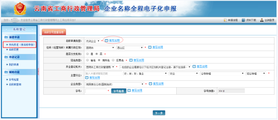 在“名稱預先核準申請書”標簽頁,首先登記名稱信息,每一個填寫項右側均有“填寫說明”,可對照進行填寫,如下圖所示。