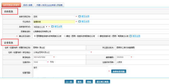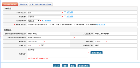 點擊【上一步】按鈕,頁面跳轉到上一步名稱信息,可對上一步的名稱信息進行修改和完善。