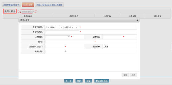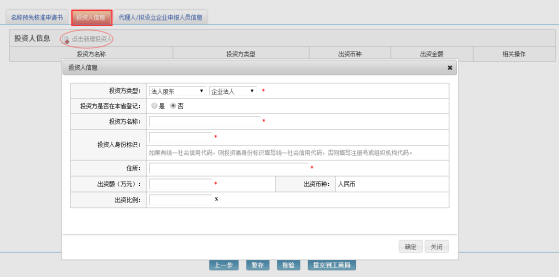 信息填寫完后,先點擊“字號”右側的【字號查重】按鈕確保所輸入的字號能使用,然后再點擊【下一步】按鈕進入到詳細信息的填寫頁面,頁面分名稱預先核準申請書、投資人信息、代理人/擬設立企業(yè)申報人員信息三個標簽頁。