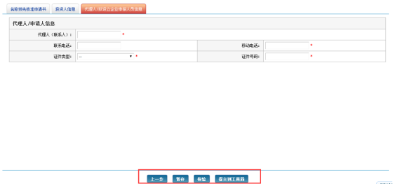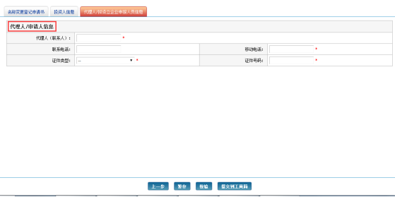 在“代理人/擬設立企業(yè)申報人員信息”標簽頁中,登記代理人/申請人信息。