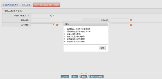名稱相關信息登記完畢后,可點擊頁面下方的【校驗】按鈕對所填寫的必填數(shù)據(jù)或其他相關限制進行校驗,如果有未填寫的必填項目或不符合要求的填寫項目,系統(tǒng)會給出相關提示,如下圖所示;