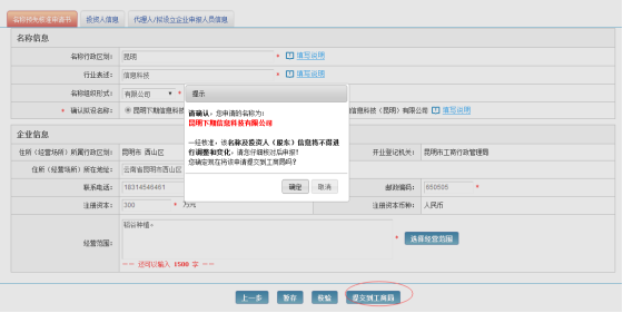如果校驗通過,則點擊【提交到工商局】按鈕將信息提交,系統(tǒng)會彈出確認框,點擊【確認】后,提交名稱申報信息成功。如下圖。