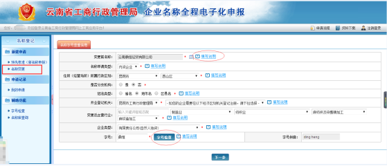 信息填寫完后,先點擊“字號”右側的【字號查重】按鈕確保所輸入的字號能使用,然后再點擊正下方的【下一步】按鈕進入到下一步頁面進行詳細信息的填寫,頁面分名稱變更登記申請書、投資人信息、代理人/擬設立企業(yè)申報人員信息三個標簽頁。