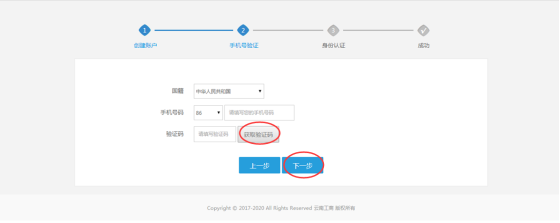 創(chuàng)建賬號時,按要求依次填寫“真實姓名”、“證件類型”、“證件號”、“賬號名”、“密碼”等,然后點擊【下一步】按鈕進入到手機號驗證頁面,如下圖。