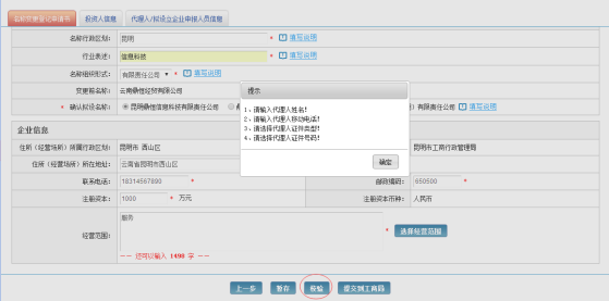 變更的名稱相關信息登記完畢后,可點擊下方的【校驗】按鈕對所填寫的必填數(shù)據(jù)或其他相關限制進行校驗,如果有未填寫的必填項目或不符合要求的填寫項目,系統(tǒng)會給出相關提示,如下圖。