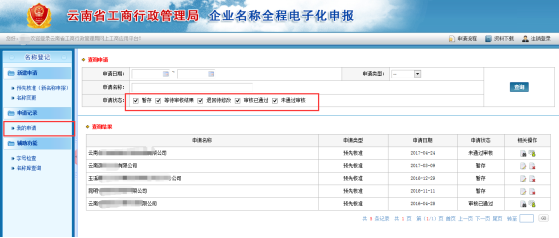 進入“我的申請”查詢頁面,輸入查詢條件,比如申請名稱、申請日期、申請類型、申請狀態(tài)等多種條件,“申請狀態(tài)”勾選“審核已通過”狀態(tài),點擊【查詢】按鈕,可查詢出工商審核已通過的名稱申請信息。