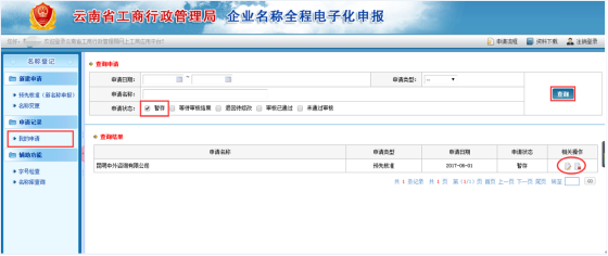 進入“我的申請”查詢頁面,輸入查詢條件,比如申請名稱、申請日期、申請類型、申請狀態(tài)等多種條件,“申請狀態(tài)”勾選“暫存”狀態(tài),點擊【查詢】按鈕,可查詢出暫存的名稱申請信息。