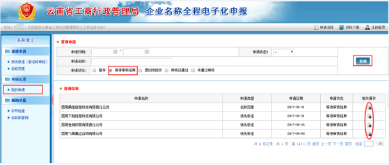 進入“我的申請”查詢頁面,輸入查詢條件,比如申請名稱、申請日期、申請類型、申請狀態(tài)等多種條件,“申請狀態(tài)”勾選“等待審核結果”狀態(tài),點擊【查詢】按鈕,可查詢出已提交工商局等待審核結果的名稱申請信息。