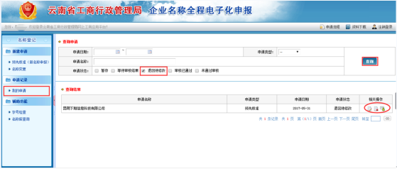 進入“我的申請”查詢頁面,輸入查詢條件,比如申請名稱、申請日期、申請類型、申請狀態(tài)等多種條件,“申請狀態(tài)”勾選“退回待修改”狀態(tài),點擊【查詢】按鈕,可查詢出工商審核后退回待修改的名稱申請信息。