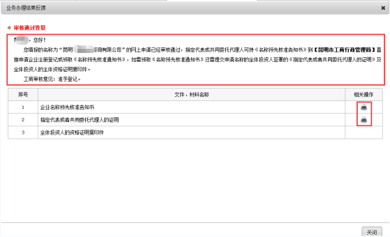 圖標按鈕,進入預審意見頁面,查看預審通過答復、打印《企業(yè)名稱預先核準告知書》和《指定代表或者共同委托代理人的證明》文書,如下圖所示。