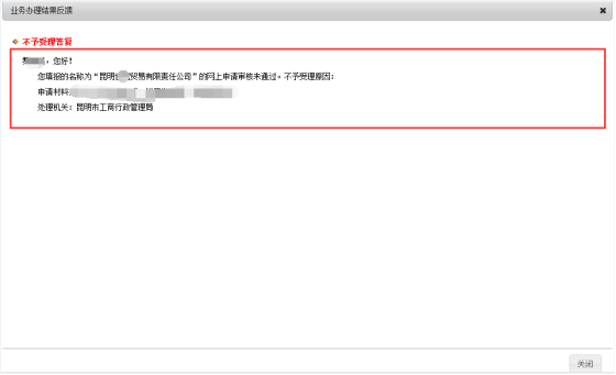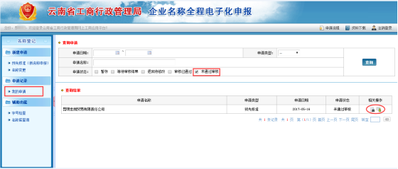 進入“我的申請”查詢頁面,輸入查詢條件,比如申請名稱、申請日期、申請類型、申請狀態(tài)等多種條件,“申請狀態(tài)”勾選“未通過審核”狀態(tài),點擊【查詢】按鈕,可查詢出工商審核未通過的名稱申請信息。