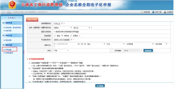 點擊左側菜單的“輔助功能->字號檢查”,進入待查字號信息頁面,詳細閱讀下方的字號檢查信息項說明。“待查字號信息”可以輸入“受理方向”、“行政區(qū)劃”、“登記機關”、“名稱行業(yè)”、“字號”等。