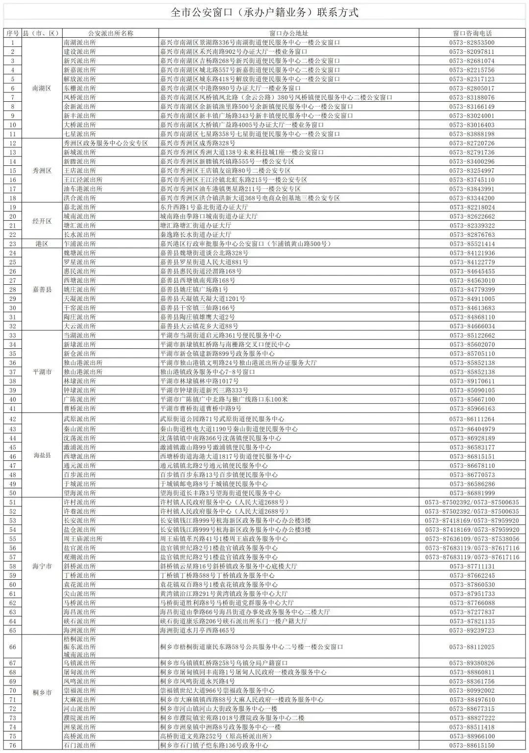 嘉興市全市公安窗口(承辦戶籍業(yè)務)聯(lián)系方式